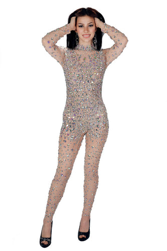 Full Rhinestone Sheer Mesh Bodysuit – Long Sleeve Sparkly Jumpsuit for Performance, Dance, Club & Stage