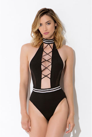 Halter Scalloped Teddy with Fluttery Ruffles at Hip and Plunging Halter Neckline