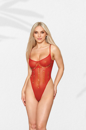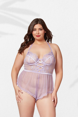 Sexy Mesh & Floral Embroidery Halter Neck Teddy – Sheer Nude Mesh with High Cut Leg & Thong Back