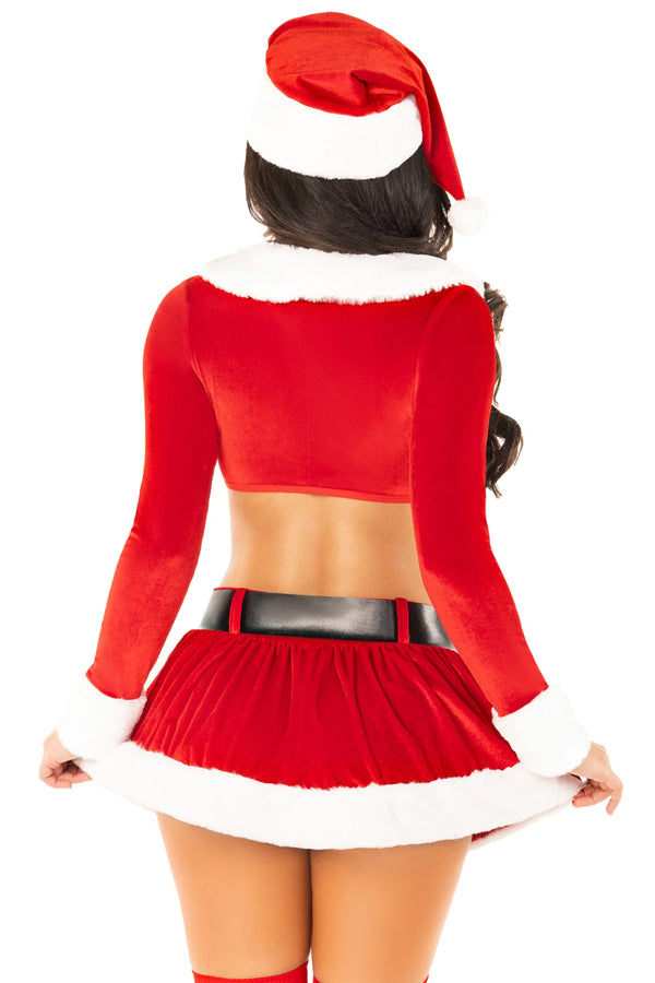 • 4-PC Sexy Santa Costume: Includes velvet crop top, matching mini skirt, wide Santa belt, and classic Santa hat for a complete holiday look.