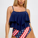Celebrate summer in effortless style with the Margaret Tankini Set, where elegance meets bold Americana flair. Designed for comfort and confidence, this two-piece swimwear set features a soft, double-layer flounce top with a flattering high-low silhouette and adjustable straps for the perfect fit. The standout USA print bottom includes tummy control and front ruching, sculpting your silhouette with a stylish boost.