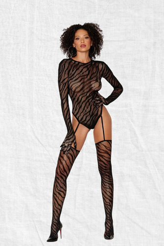 Zebra Fishnet Teddy Bodystocking, Long Sleeves Lingerie SetSave Upto 20%