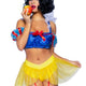 Give that evil queen something to really be jealous of in the Three piece Bad Apple Snow White costume set. The iconic princess costume features a character styled crop top with shimmer halter bandeau, cheeky panty with glitter skirt and attached garters, and a bow headband. Pair your storybook character costume with thigh highs and a wig to take this cosplay costume look to the next level. (Poisoned apple not included)