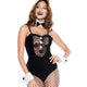 Spaghetti straps teddy with front lace panel and button accents, lace headband, bow choker, wrist cuffs, and plush tail.
