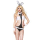 Step into playful elegance with the 4-piece Delightful Rabbit costume. This set features a tuxedo-look teddy and includes a matching belt, handcuffs, and headband to complete the fun, themed outfit. Perfect for costume parties or special occasions.