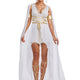 The flowing dress features a sheer overskirt and chiffon sashes, adding a soft, ethereal touch that enhances every movement. Gold trim embellishments create a regal, divine look, while the gold leaf headpiece and matching armbands complete the transformation into a true goddess.