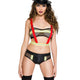 - 4-piece set: strapless fishnet top, panty, suspenders & hat
