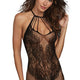 Fishnet bodystocking with knitted “teddy” design, strappy neckline, adjustable halter ties, open crotch (G-String not included).