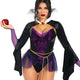 Four Pieces Poison Apple Queen Costume Set Includes snap crotch bodysuit with velvet brocade detail and iridescent skirt, velvet shrug with jewel closure and gauntlet sleeve, gold rope belt, and crown. Pair your storybook character costume with thigh highs and a wig to take this cosplay costume look to the next level.