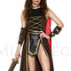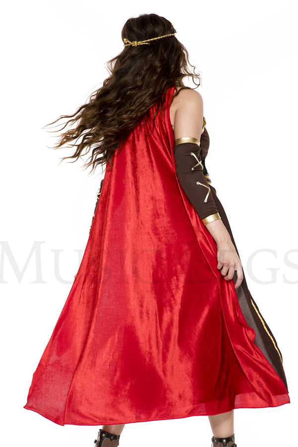 4-Piece Warrior Costume Set: Includes gold ribbon lace-up dress with attached belt & front panel, detachable cape, criss-cross arm warmers, and matching headband.