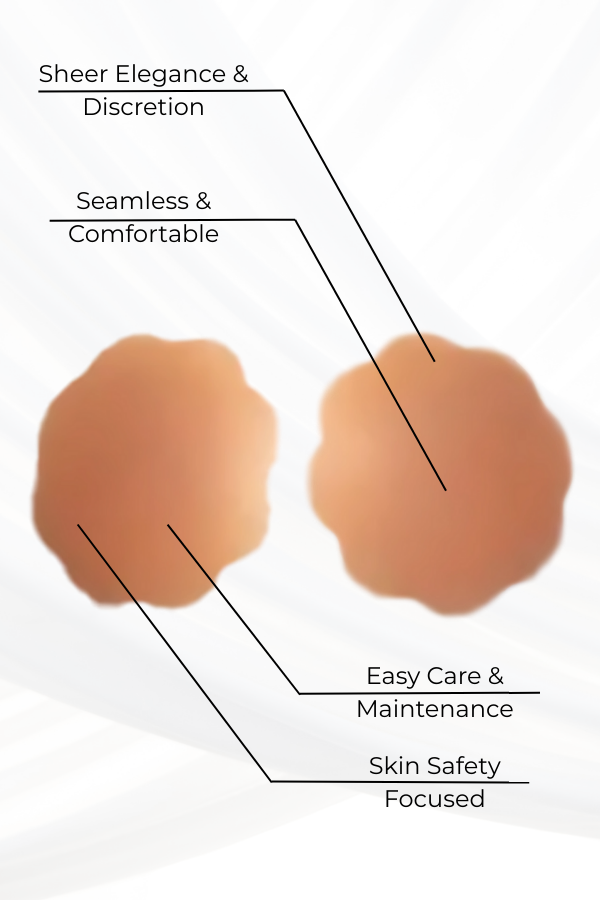 Infuse a touch of sheer elegance into your wardrobe essentials with our beautifully designed floral shape covers. Crafted for the discerning woman who appreciates both discretion and style, these covers provide seamless coverage, ensuring your confidence in wearing sheer, light, or form-fitting garments. Featuring seamless flower-shape, non-adhesive covers.