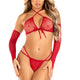 Turn up the heat with this daring lingerie set designed to captivate attention and exude confidence. Effortlessly sexy, this bold ensemble features a mini heart net crop top with a keyhole crossover front, paired with a dual-strap G-string and matching gauntlet gloves for a complete, head-turning look.