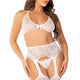 Set the stage for an unforgettable night with this Stunning Lace Lingerie Set . Adorned with hand-laid rhinestones, this sultry bra top and panty set features exquisite floral lace fabric that flatters every curve. The flirty garter belt and fishnet stockings complete this irresistible look, making it perfect for a night full of romance and allure.