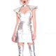 Mini wet look dress with shoulder pads, matching choker, and back lace up thigh high.
