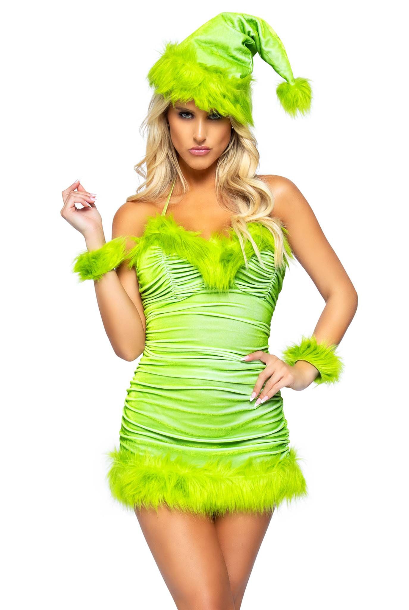 Two piece Naughty Santa Costume Set features Fishnet teddy with marabou trim and attached fishnet stockings with lace top