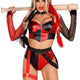 Two-Piece Harley Costume Set includes a zip-up crop top with gloved net sleeves and bottoms with attached garter. Whether you're aiming to impress at the Halloween party with a bold costume or add some excitement to your look, this outfit is an excellent choice.