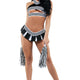 Bring playful confidence to your costume collection with the Varsity Vixen Costume Set. This flirty, coordinated look features a V-shaped striped elastic underboob top paired with a black-and-white pleated skirted panty for a sporty-meets-sultry vibe. Finished with matching pom-poms, this adult costume set is perfect for themed parties, roleplay looks, and standout festival or rave outfits.